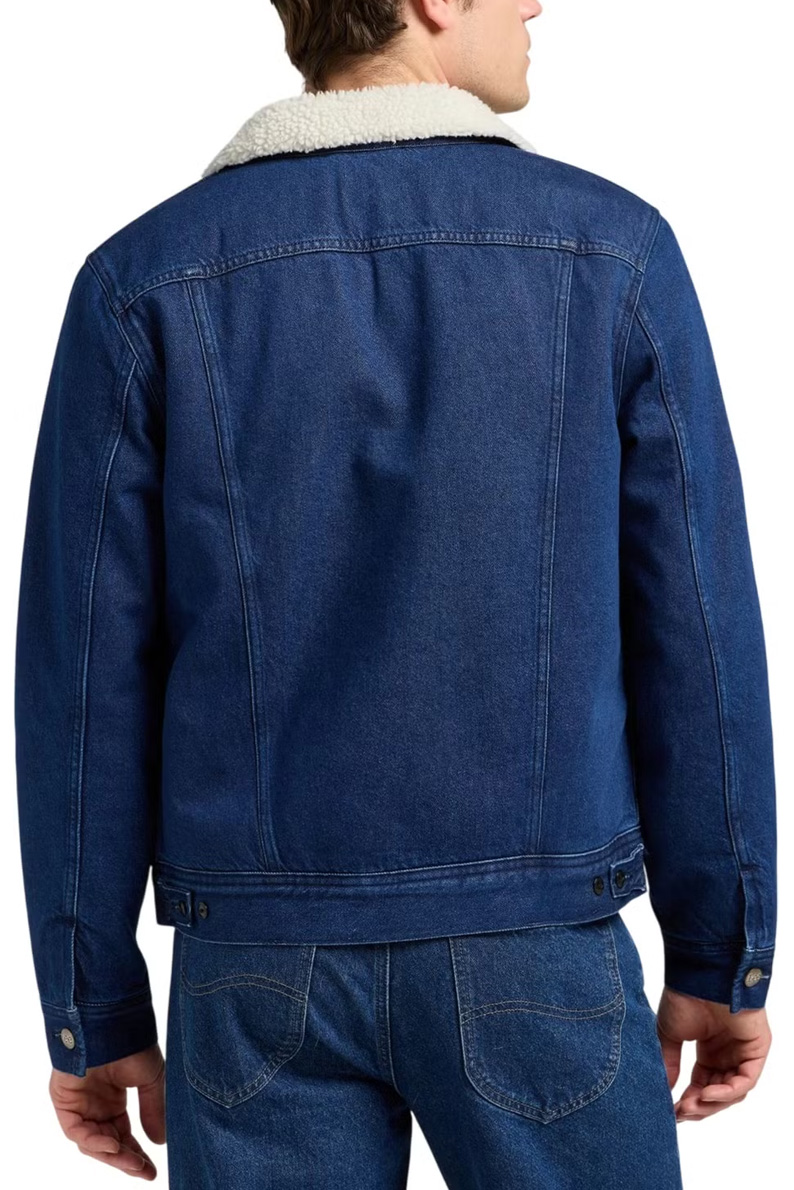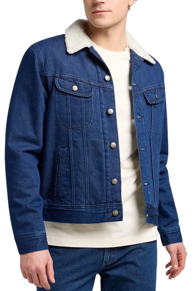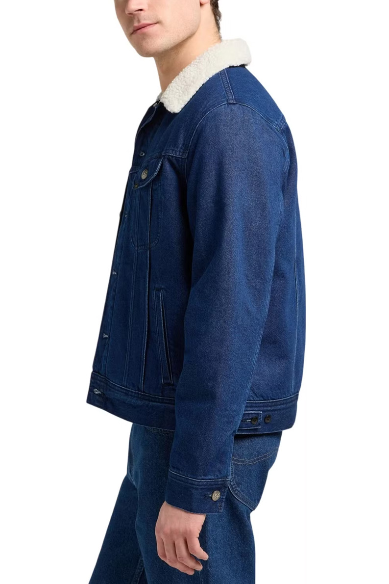 Мужская джинсовая куртка Lee Sherpa Jacket Regular 112370428 на искусственном меху изготовлена из материала высокого качества. Состав 100% хлопок. Цвет синий. Вид застежки — «болты». Четыре внешних кармана.
