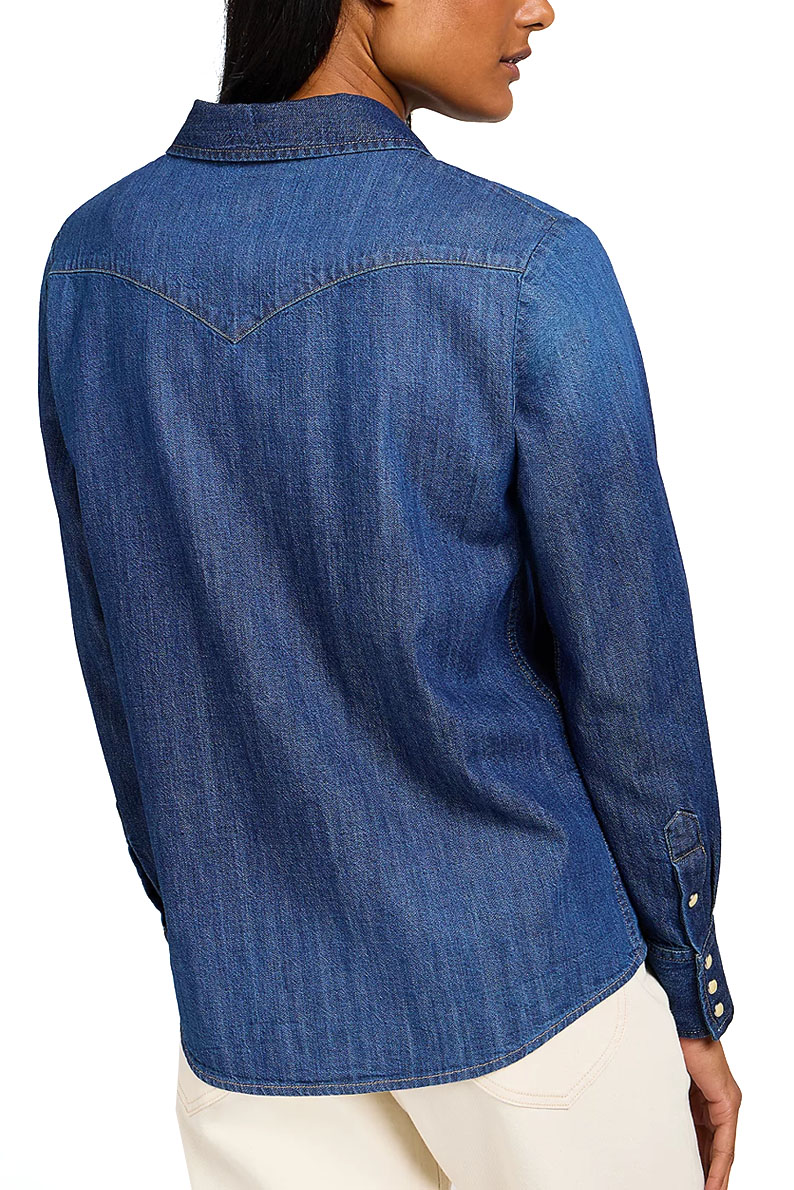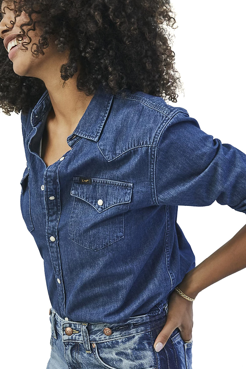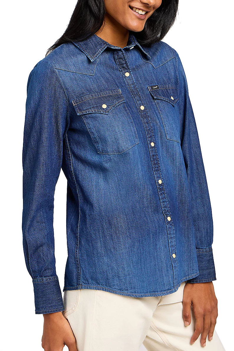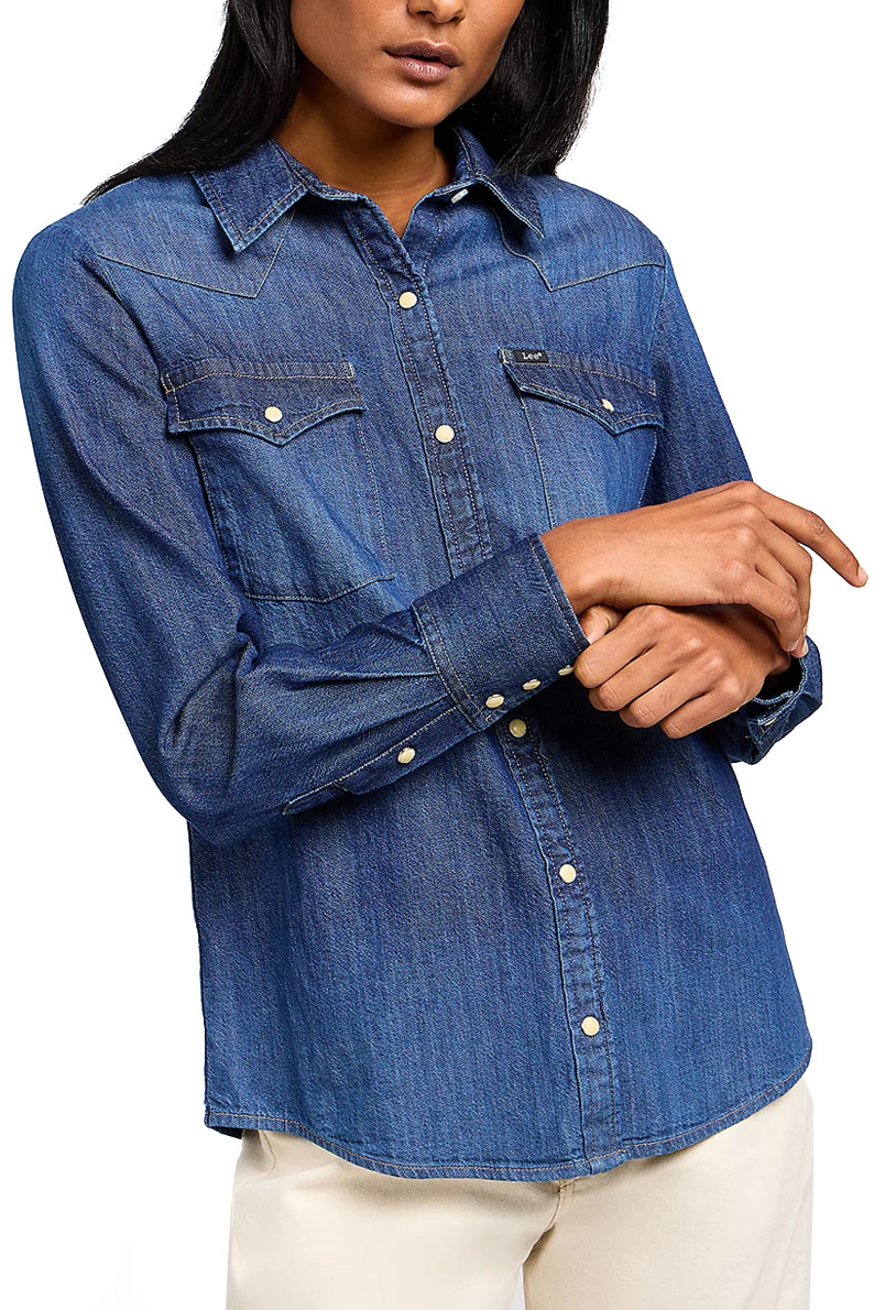 Женская рубашка Lee Regular Western Shirt Trough The Woo изготовлена из материала высокого качества. Прямой крой. Застежки — кнопки. Состав 100% хлопок. Цвет синий.