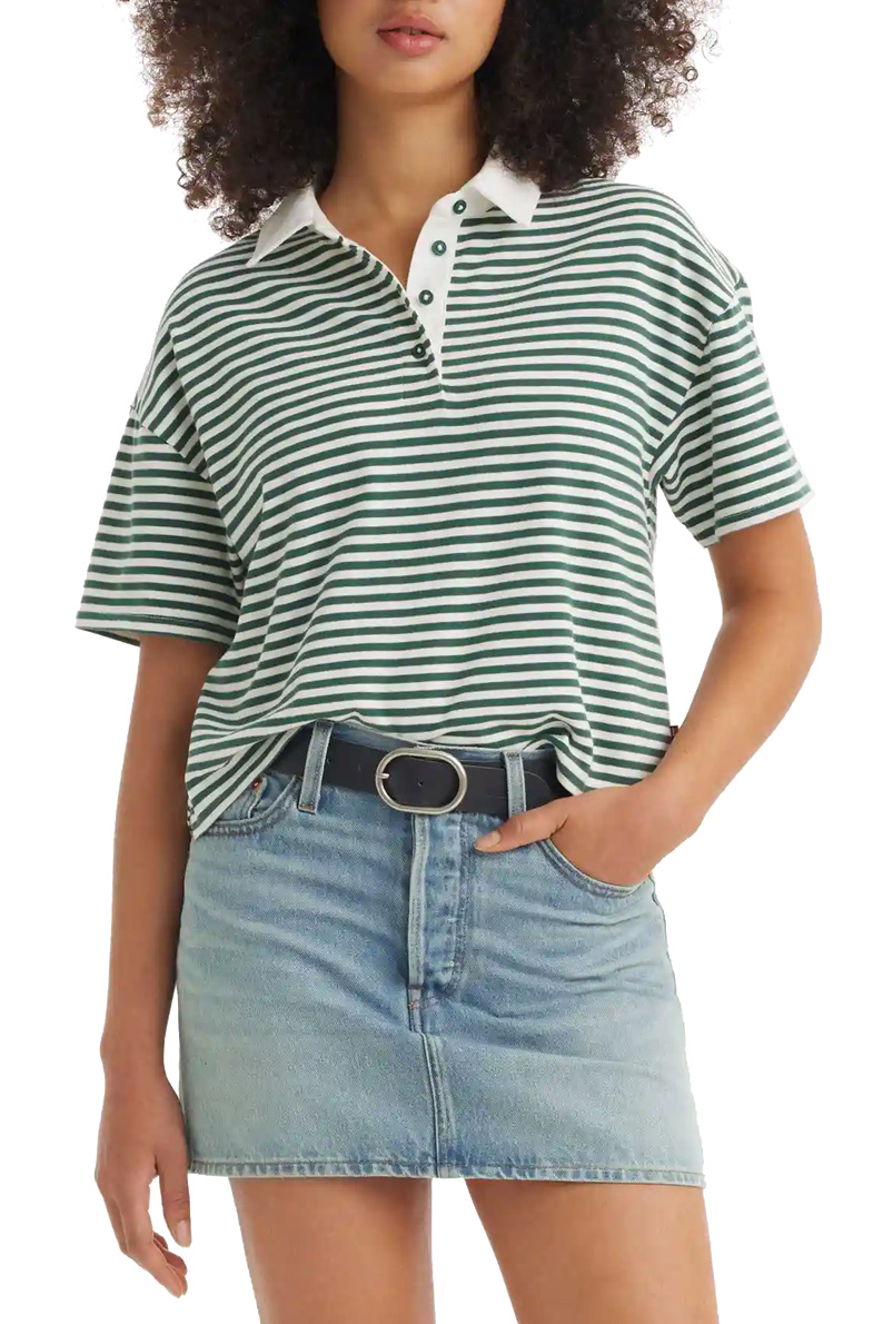 Футболка-поло женская Levi’s Coco Short Sleeve Rugby Shirt. Изготовлена из 100% хлопковой ткани высокого качества. Цвет зеленый. Прямой классический крой.