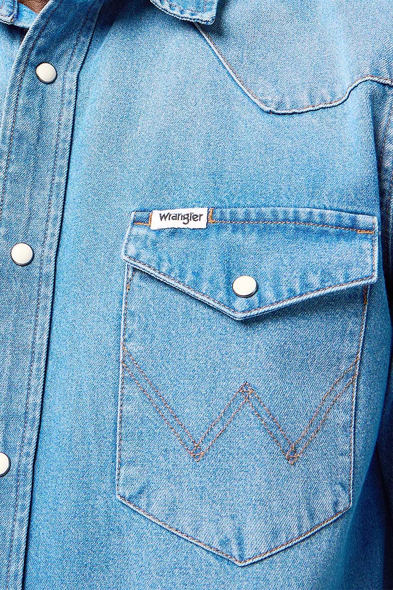 Мужская джинсовая рубашка Wrangler Western Shirt Mid Light Wash 112362744, изготовлена из материала высокого качества. Состав 100% хлопок. Рубашка очень приятная к телу. Вид застежки кнопки. Классический прямой покрой.