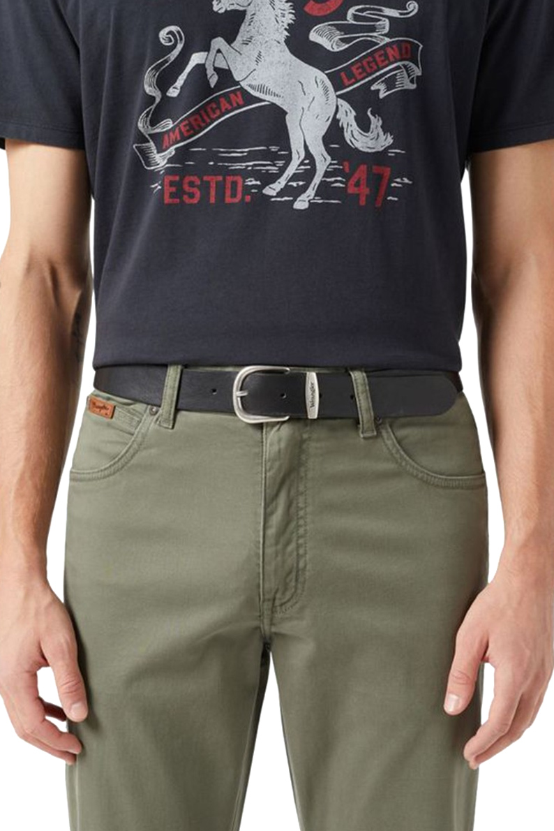 Ремень Wrangler изготовлен из натуральной кожи. Цвет черный. Ширина полотна 3,4 см. Модель имеет металлическую пряжку размером: 4,5 х 4,5 см. Очень красивый и стильный ремень.